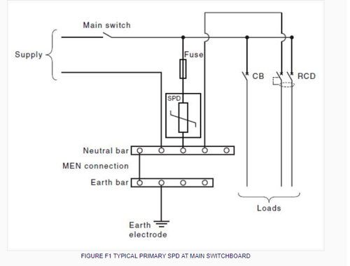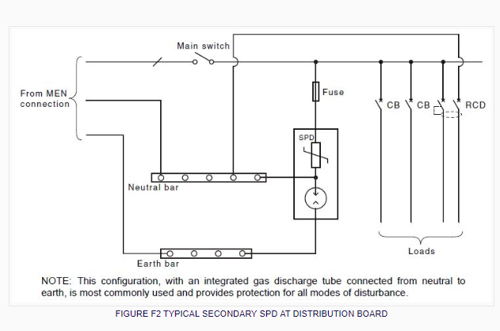 Figures F1 and F2 from AS/NZS 3000:2018 below show connection arrangement for primary and secondary surge protection devices respectively. It should be noted that some devices may have specific installation requirements as specified in the manufacturer’s instructions.